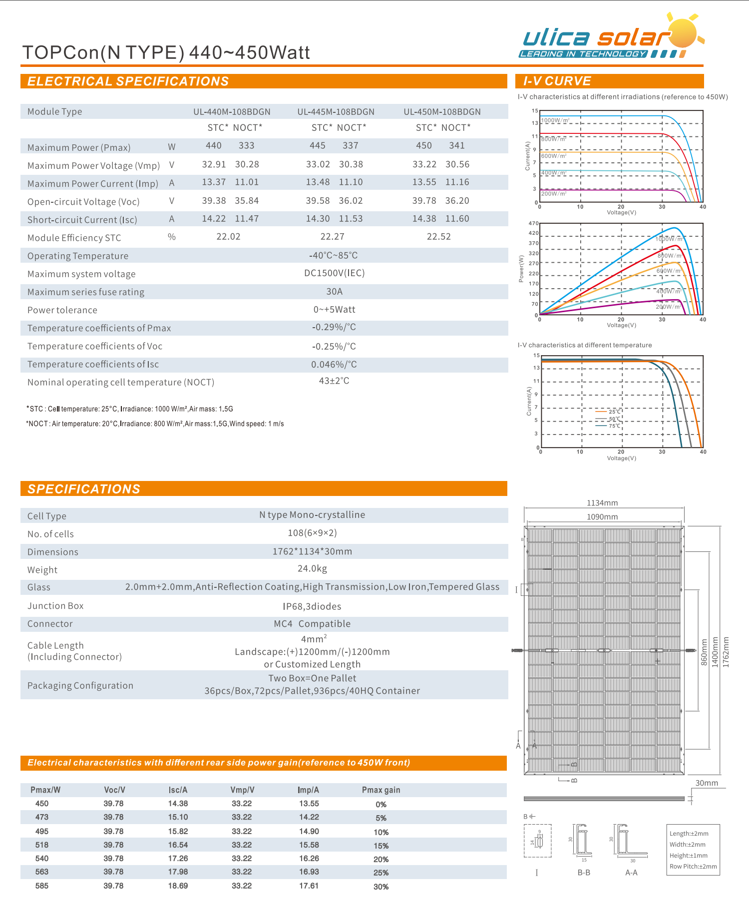Das Ulica Solar Jade Flow 450 W Modul kombiniert moderne N-Type TOPCon-Technologie mit bifazialem Glas-Glas-Design. Mit einer Nennleistung von 450 Watt liefert es hohe Energieerträge bei kompakteren Abmessungen. Die Glas-Glas-Bauweise sorgt für Stabilität, Widerstandsfähigkeit gegen Mikrorisse und eine besonders lange Lebensdauer.